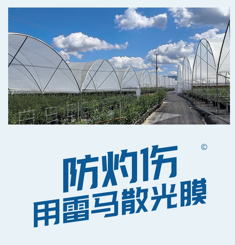 3、高度散射率:可以使溫室內(nèi)的光照和溫度更加均勻,提高藍(lán)莓對(duì)光的吸收程度,能最大程度減少直射光對(duì)藍(lán)莓及葉片造成的灼傷。