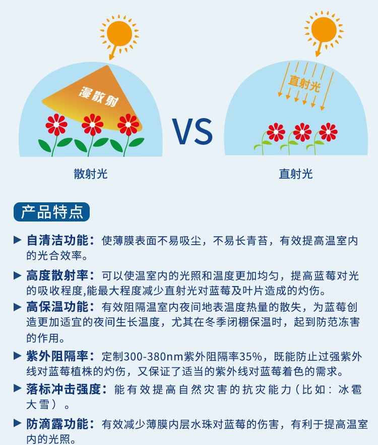 1、防滴露功能: 有效減少薄膜內(nèi)層水珠對(duì)藍(lán)莓的傷害,有利于提高溫室內(nèi)的光照。