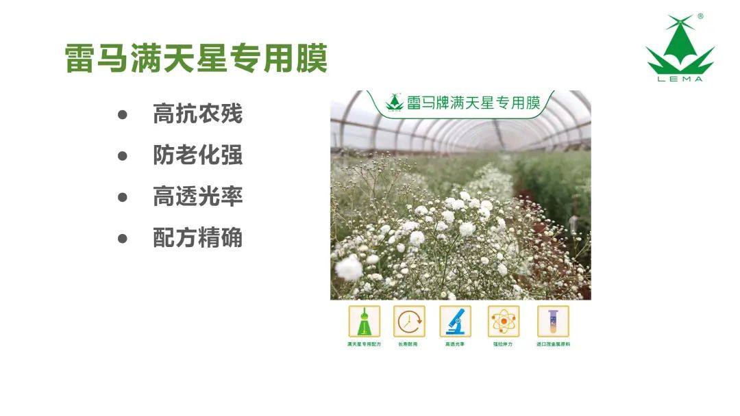 雷馬產(chǎn)品涵蓋農(nóng)用地膜、大棚膜、散光膜、水池布、彩條布、防雨布、遮陽網(wǎng)等,同時以專業(yè)化、精準化、個性化服務(wù)于花卉、蔬菜、漿果、馬鈴薯、藥材、果林果樹等經(jīng)濟作物種植及農(nóng)場養(yǎng)殖現(xiàn)代設(shè)施農(nóng)業(yè)領(lǐng)域?qū)S卯a(chǎn)品的定制服務(wù),提供專業(yè)化種植技術(shù)解決方案。